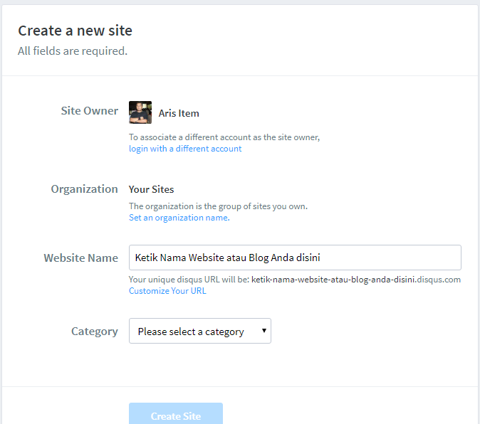 masukan nama website anda dan kategorinya, pilih 'Create Site'.