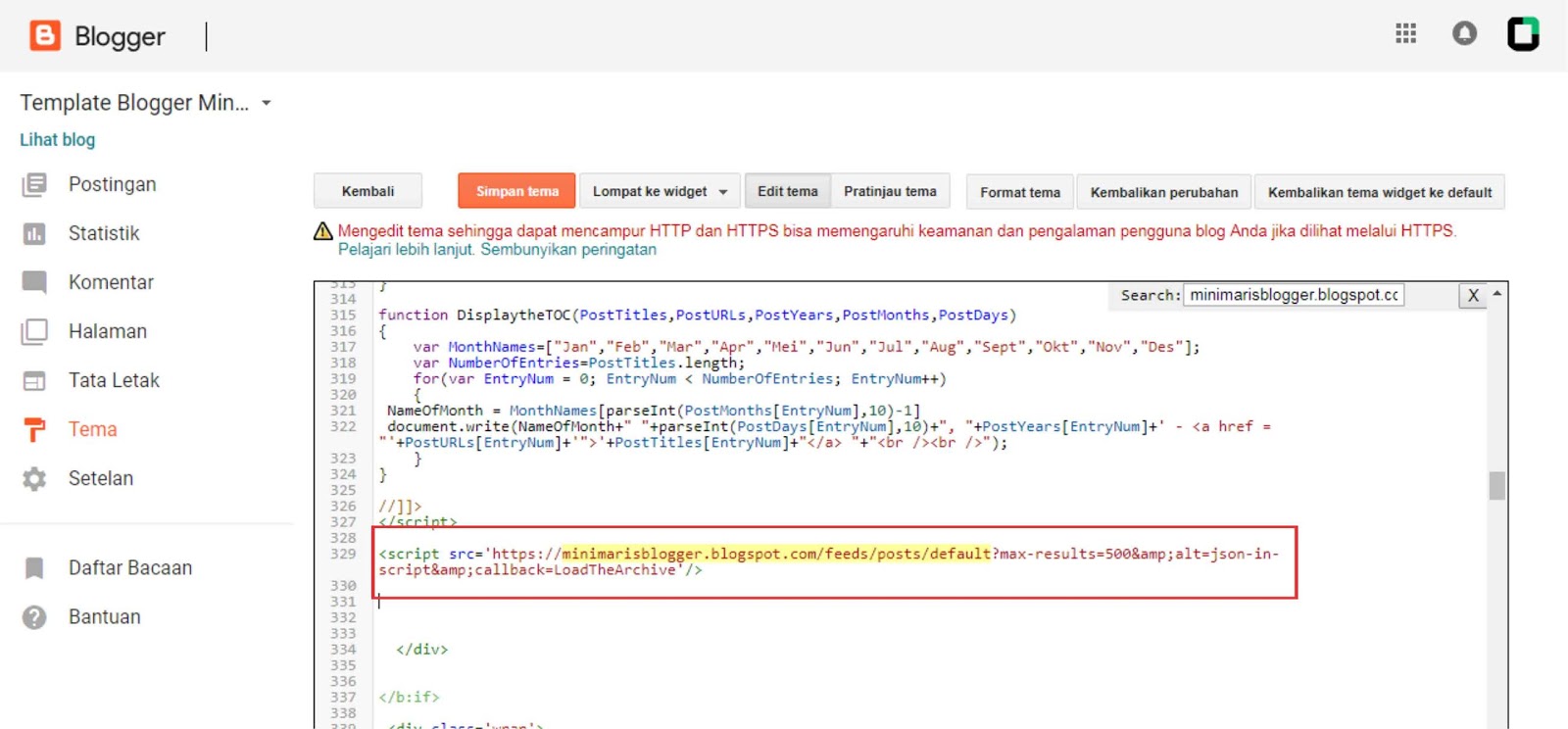 Ganti Feed Link untuk Blog Arsip di Halaman Homepage / Beranda. Tekan Control F (Untuk pencarian Text / Kode) dan masukan kode ini di kolom pencarian minimarisblogger.blogspot.com/feeds/posts/default Ganti / Edit menjadi yourwebsitename.blogspot.com/feeds/posts/default. Lihat gambar.