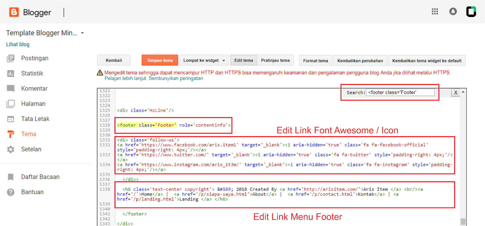 Copy Paste <footer class='Footer setelah itu edit bagian menu dan link footernya. Lihat pada gambar.