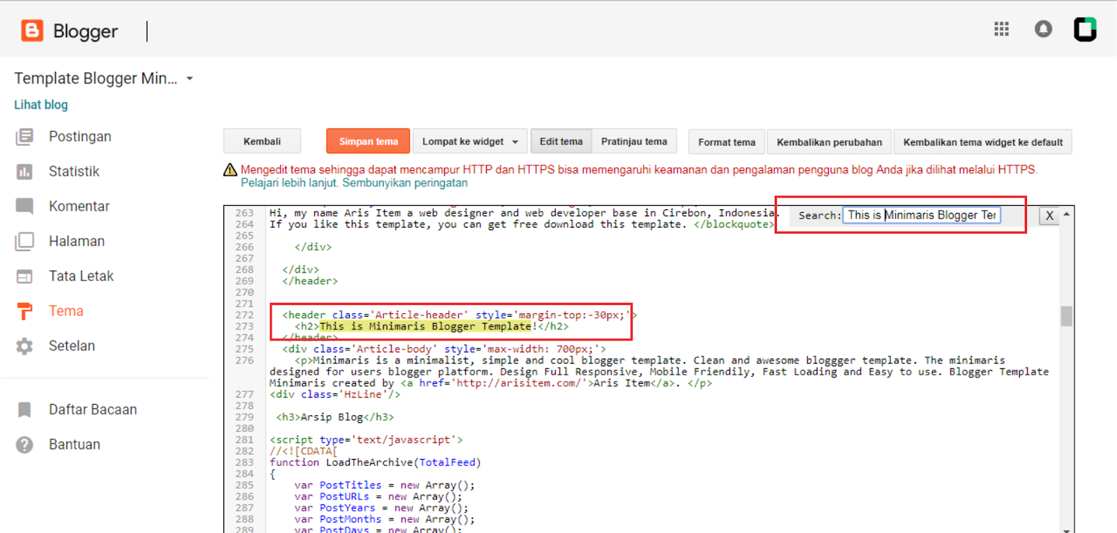 Contoh : Ganti / Edit Header Title (Judul Header), copy paste <header class='Article-header', lalu tekan control F (untuk pencarian text / kode), lalu masukan kode tadi di kolom pencarian text, atau kamu juga bisa langsung copy tulisan 'This is Minimaris Blogger Template' (tanpa tanda kutip) di kolom pencarian. lihat pada gambar.